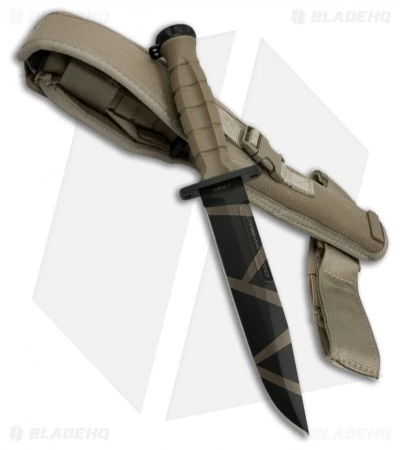 Made from a quarter inch of Bohler N690 stainless steel, the Mk2.1 is extremely tough. An aggressive swedge and dual fullers reduce weight and improve balance. The grooved and contoured tan nylon handles provides excellent grip. Carry the MK2 into the field with the tan MOLLE compatible sheath.