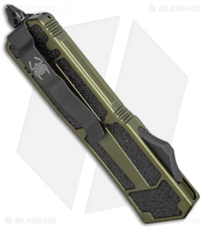 This Scarab has a two-tone black/satin finished drop point blade with a plain cutting edge. The OD green anodized 6061-T6 aluminum handle has grip inserts on front and back. Hardware, pocket clip and glass breaker are black finished.