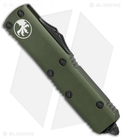 This UTX-85 model has a partially serrated, black finished Bohler M390 steel blade. The 6061-T6 aluminum handle is OD green anodized and outfitted with black finished hardware, pocket clip, and glass breaker tip.