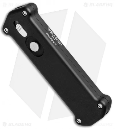Pro-Tech’s venture into the world of out-the-front knives began with the Tantilla. This model is outfitted with a CA legal blade, made from 154-CM steel in a two-tone finish. The black anodized body is constructed from T-6 6061 aluminum. It offers great automatic action, smooth operation and tight lock-up. The knife also features a safety so it won’t deploy by accident. Item includes a TiNi pocket clip for easy carry.