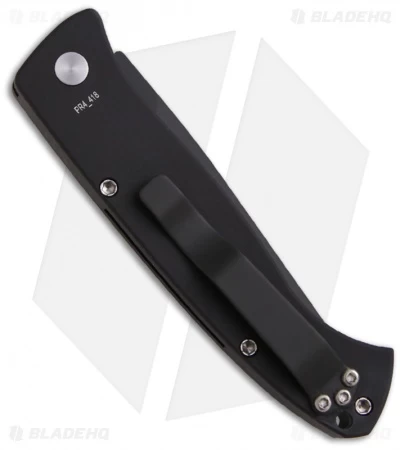 This Brend 2 automatic knife has a black finished 154-CM steel blade and black anodized T6 aluminum body with satin hardware and black pocket clip.
