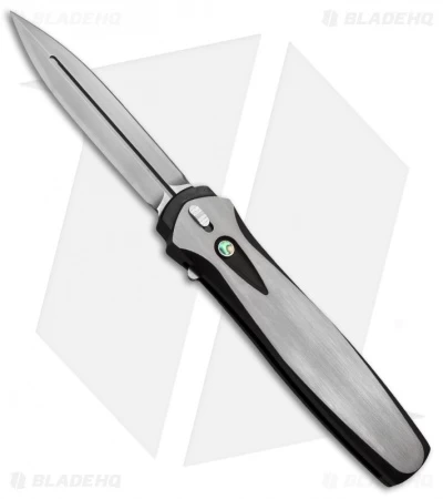 This Dark Angel from Pro-Tech is part of a numbered 3rd Run of 40 knives. It is serial numbered on the handle. The dagger blade is double-edged and satin finished. The stainless steel handle is two-tone finished, satin faces and black accents. It also features an abalone push button insert.