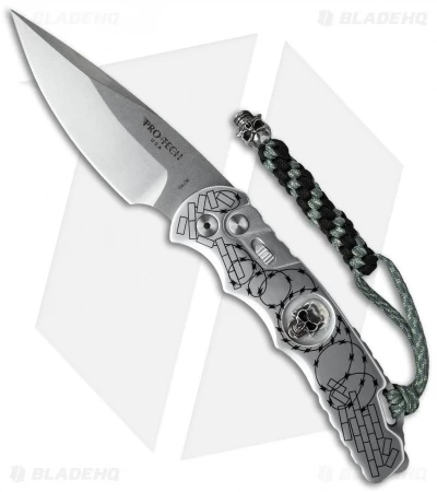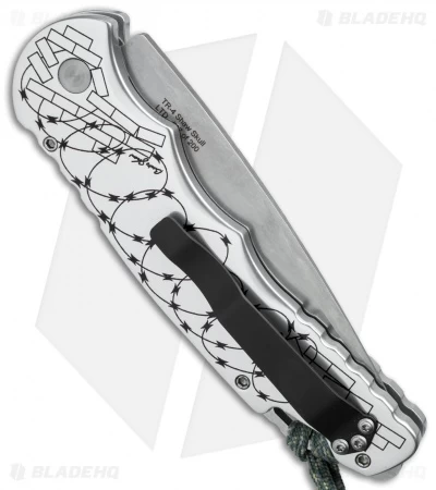 This is a limited edition TR-4 knife that features a polished silver aluminum handle with a barb wire/bricks anodized theme and a Bruce Shaw designed sterling silver skull. The blade is stonewashed and marked “TR-4 Shaw Skull LTD. #** of 200” on the back side. Includes a tied paracord lanyard with skull bead.