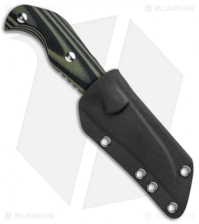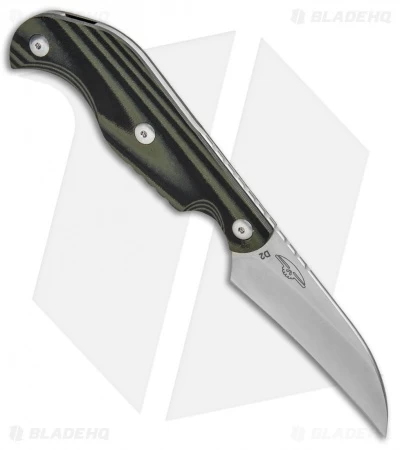 This Real Steel Banshee fixed blade has a green and black G-10 handle and a satin hawkbill blade.