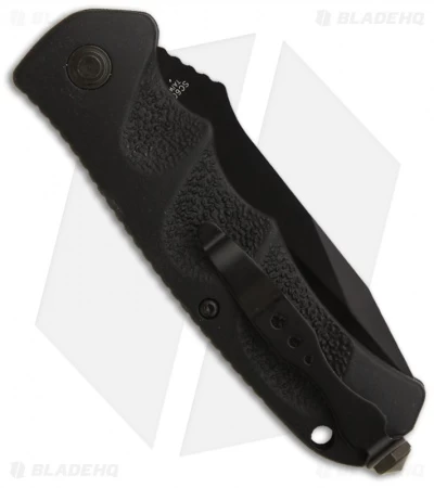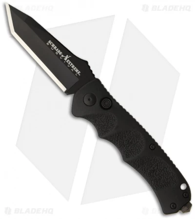 This Schrade SC60BT is a fast-action automatic knife. It has been converted in-house with superior coil springs and attention to detail. The tanto style blade on the SC60BT has a black finish and plain cutting edge along with a notched thumb ramp for improved control. Its handle is black coated aluminum with ergo-friendly scalloped finger grooves. The SC60 includes a tip-up carry pocket clip with a large diameter glass breaker tip.