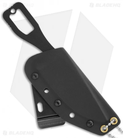 The Key-D fixed blade is a keeper. It’s a thin knife that sports a long drop point blade with some serrations for the fibrous stuff. The handle is wrapped with thin blue nylon cord. This knife includes a Kydex sheath with steel belt clip and neck chain. Whether outdoors or in combat, this is a handy knife that will serve you well.